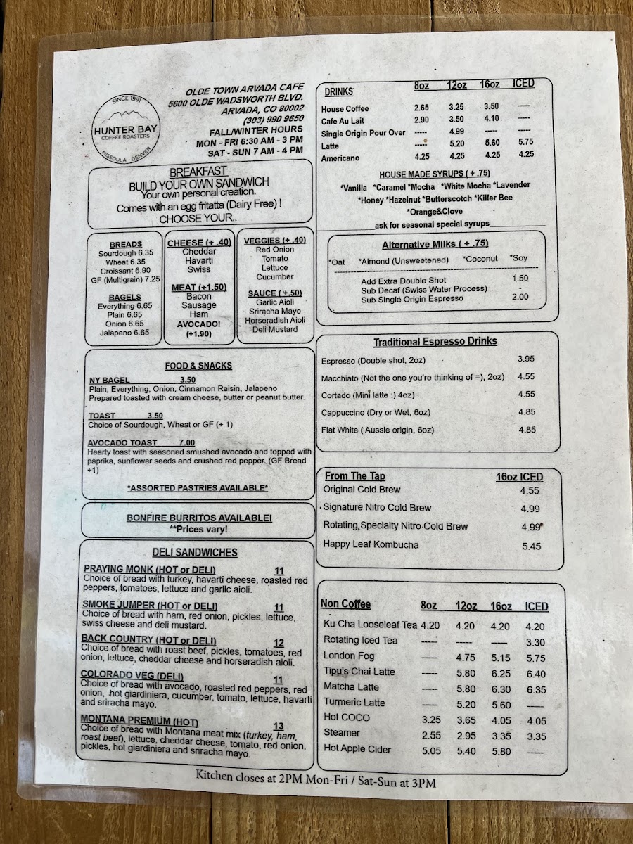 Finally, the menu rounds out with Canned and Bottled Beverages, including Bigby's Juice, Bottled Water, San Pellegrino, and Yerba Mate' Can, ensuring there’s something refreshing even for non-coffee drinkers. Overall, the menu at Hunter Bay Coffee Roasters feels cohesive and well-balanced, successfully combining artisan coffee, comforting breakfast items, hearty sandwiches, and convenient grab-and-go options into a satisfying and memorable dining experience.